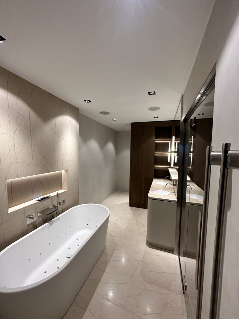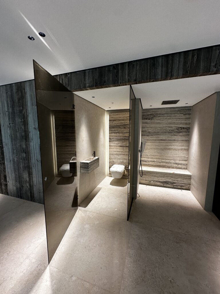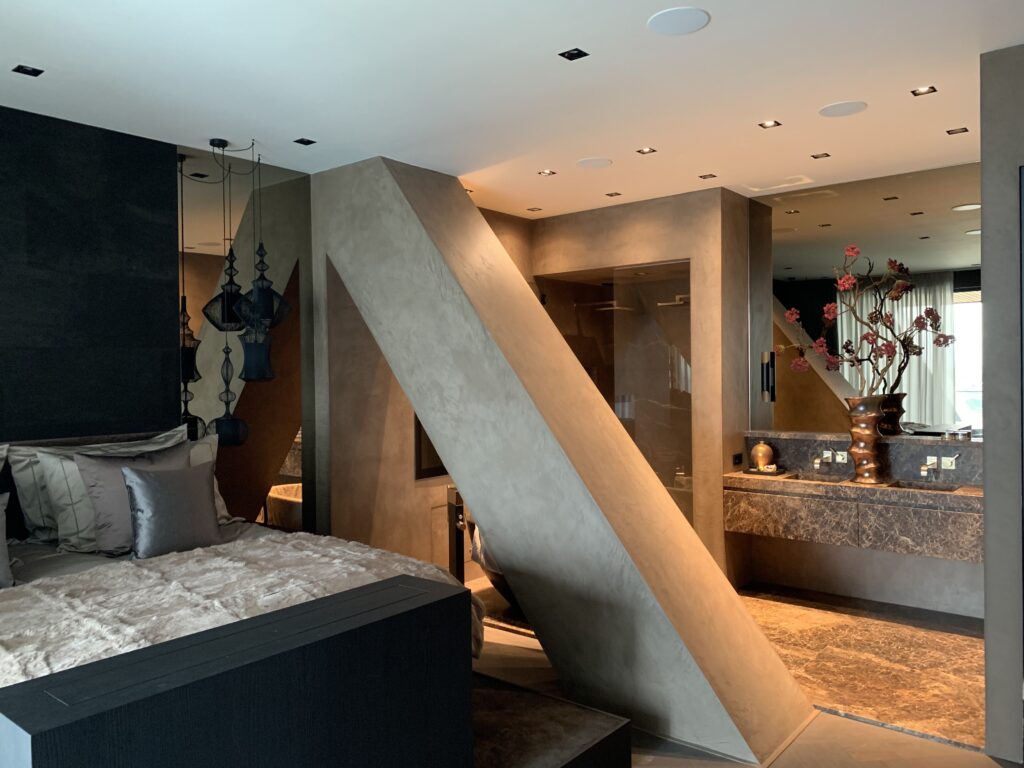 - Stucen: Vervolgens wordt het stucmateriaal, zoals micro cement, aangebracht in meerdere dunne lagen. Dit materiaal is ideaal voor badkamers en toiletten vanwege zijn waterdichtheid en duurzaamheid.